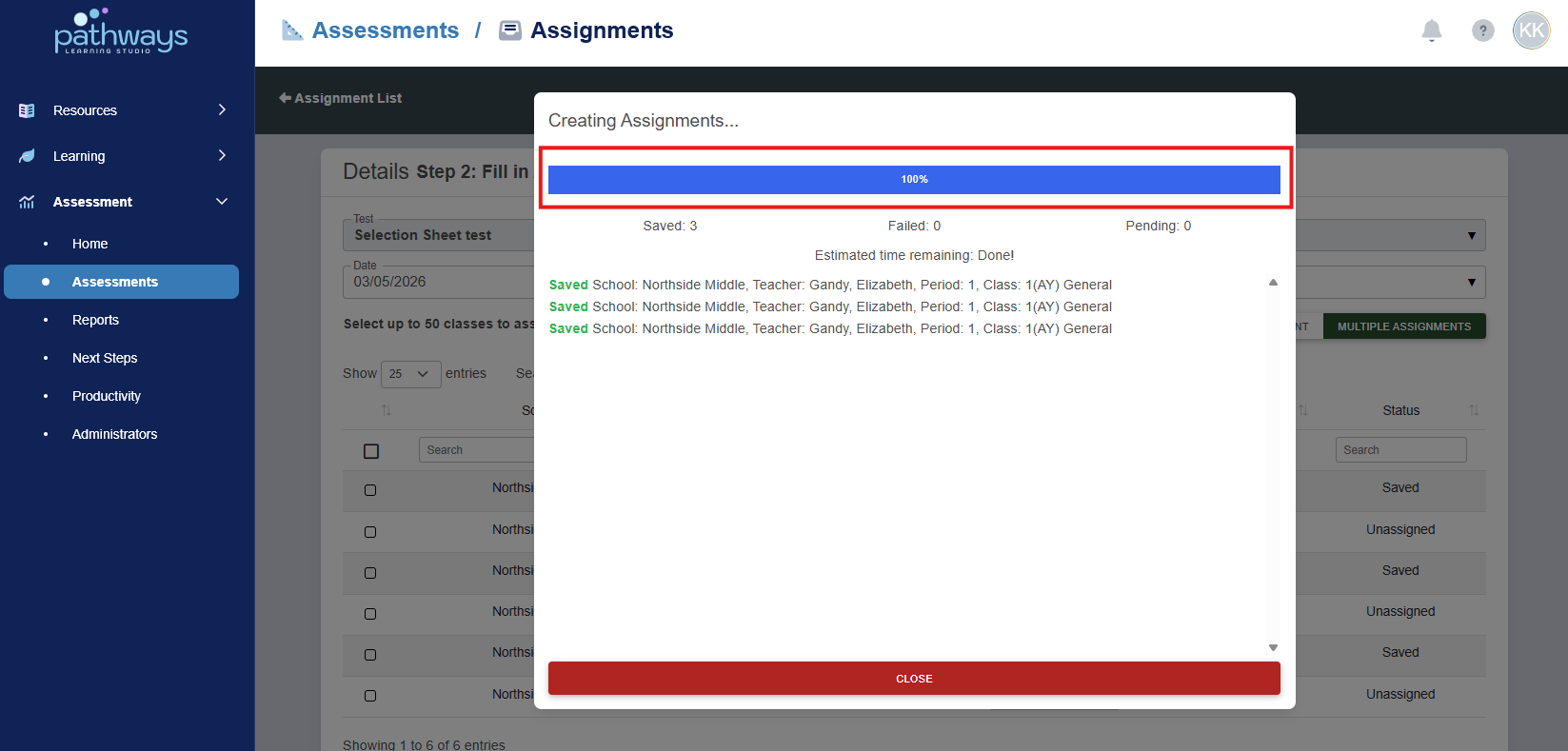Important: Do not leave the page until all assignments have saved. If you close before all assignments save, the assignments still loading will be cancelled.