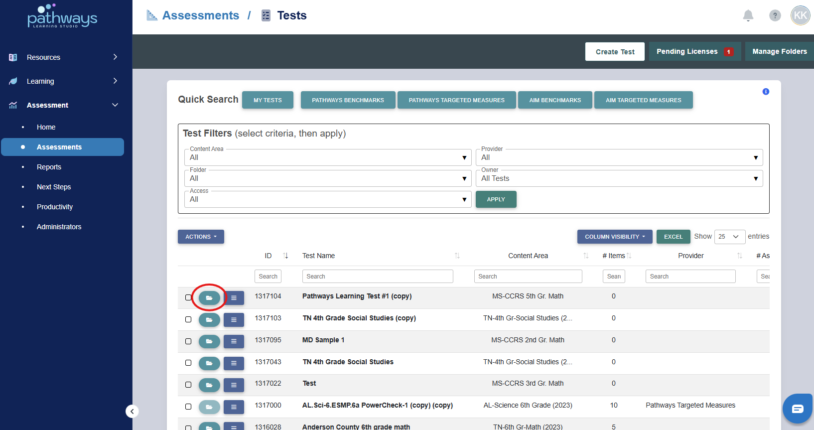 6. Locate the assessment for which you wish to view a scoring guide, and select the folder icon to the left of the assessment name.