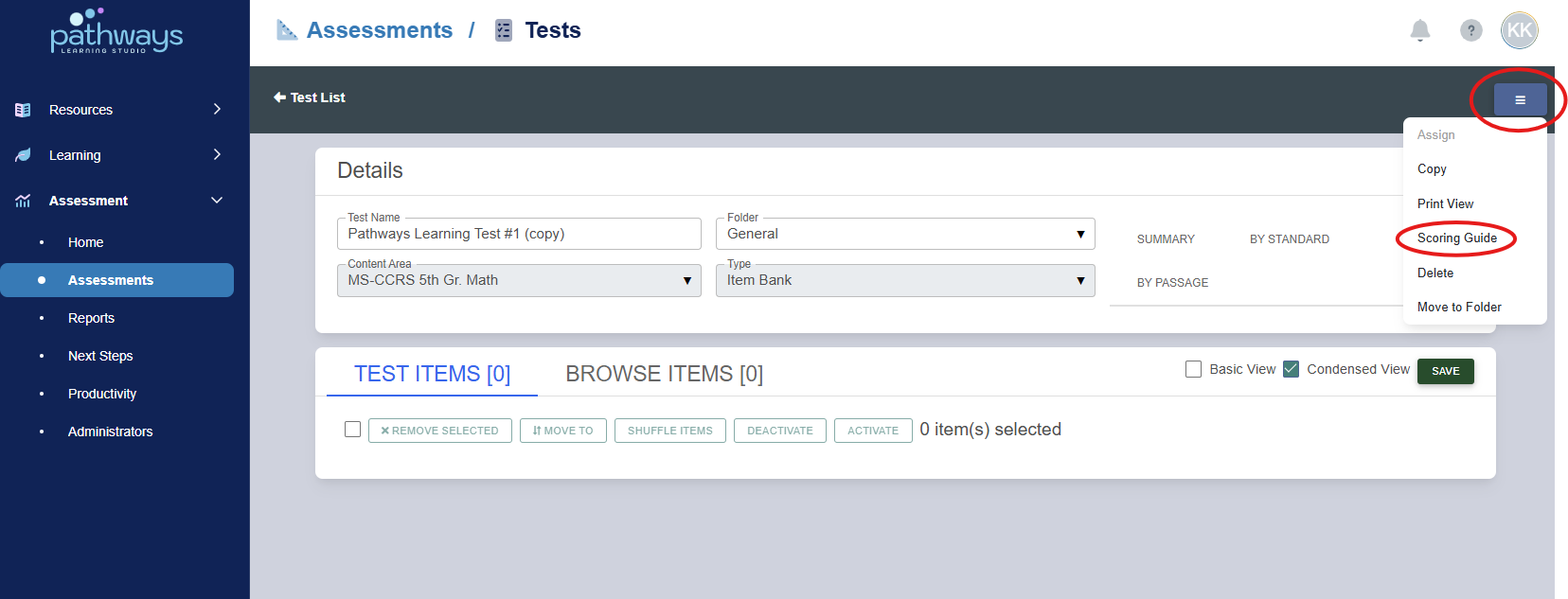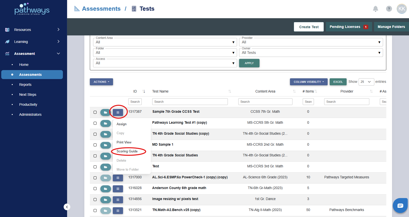 Note: It is also possible to view an assessment's scoring guide from the test list by selecting 'Scoring Guide' from the collapsed menu beside the folder icon.