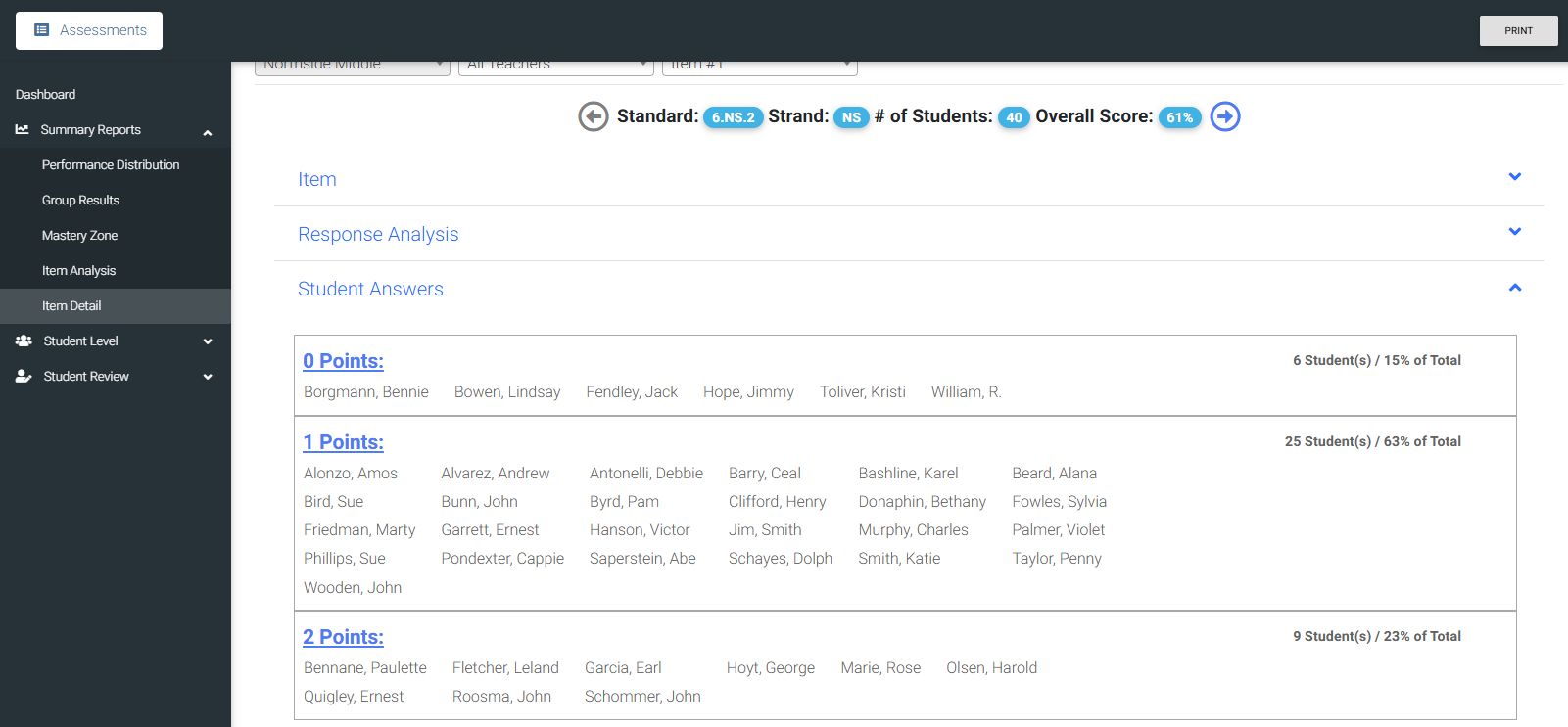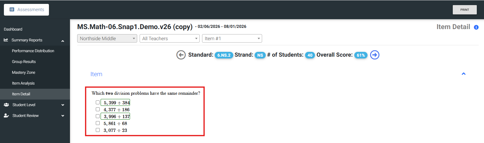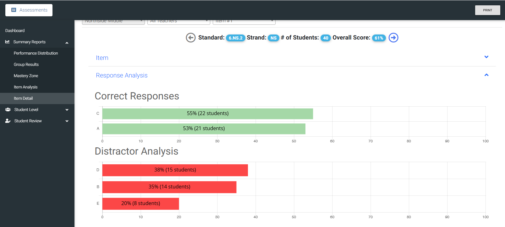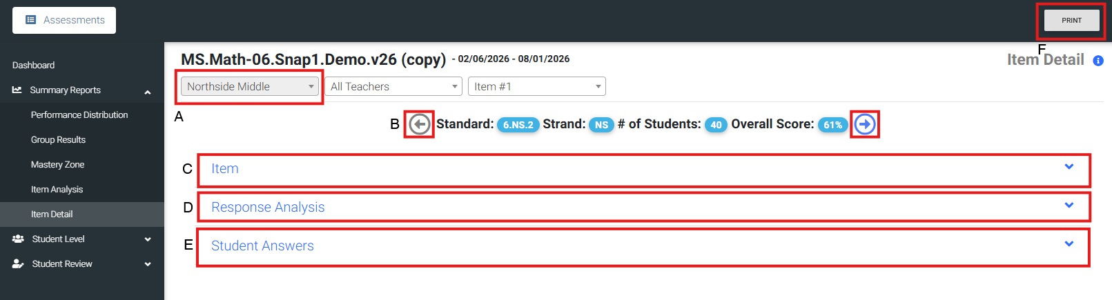 The Item Detail report displays the original item, analysis of responses, and actual student answers.