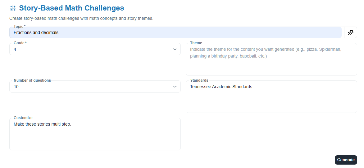 HOW: Enter the topic, grade level, a specific theme (optional), standards, and any customizations. Once generated, copy the output into Google Docs or Word. Review a sample document.