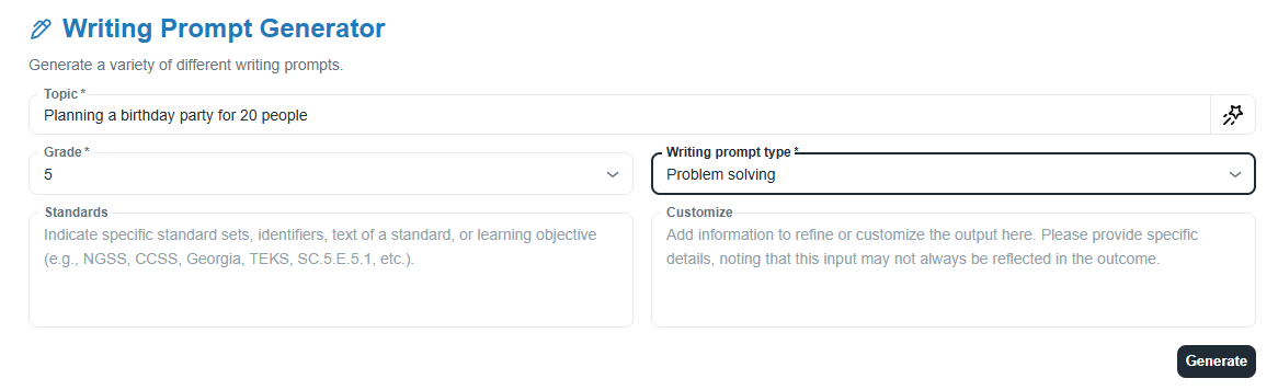 HOW: Enter the topic, grade level, writing prompt type, standards, and any customizations. Once generated, copy the output into Google Docs or Word. Review a sample document.