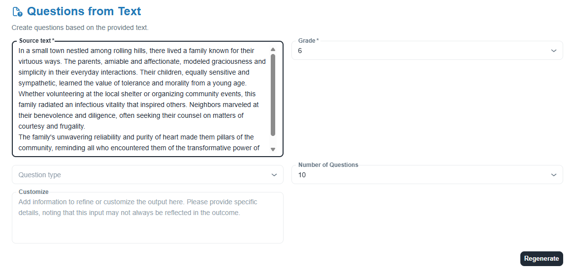 HOW: Enter the text, grade level, and any customizations. Once generated, copy the output into Google Docs or Word. Review a sample document.