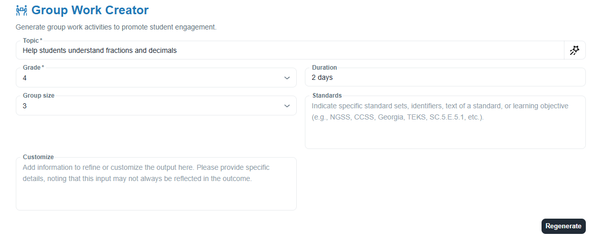HOW: Enter the topic, grade level, the size of the group, duration of the activity, standards, and any customizations. Once generated, copy the output into Google Docs or Word. Review a sample document.