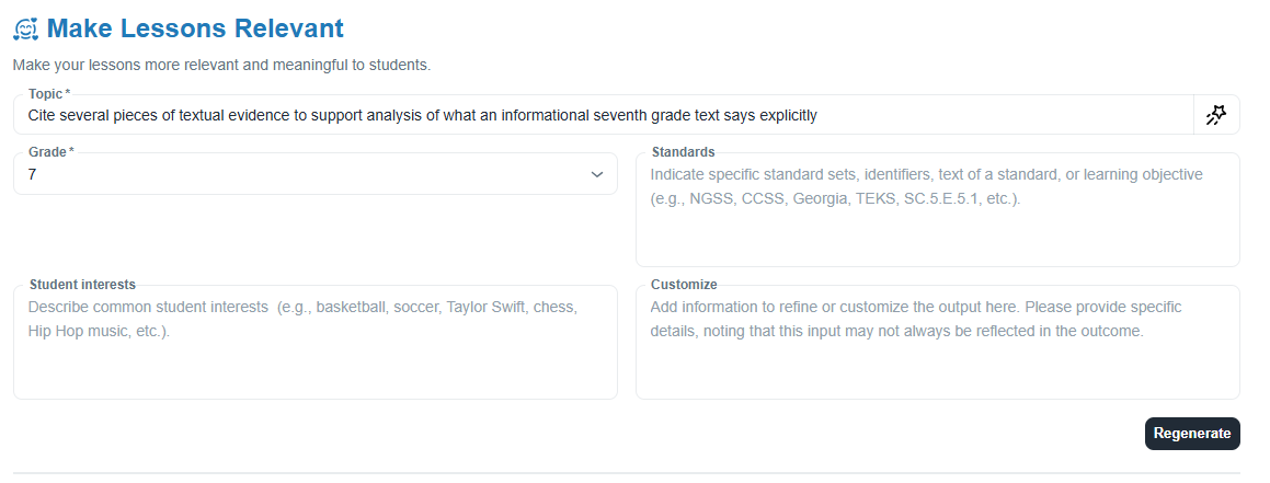 HOW: Enter the topic, grade level, standards, student interests and any customizations. Once generated, copy the output into Google Docs or Word. Review a sample document.